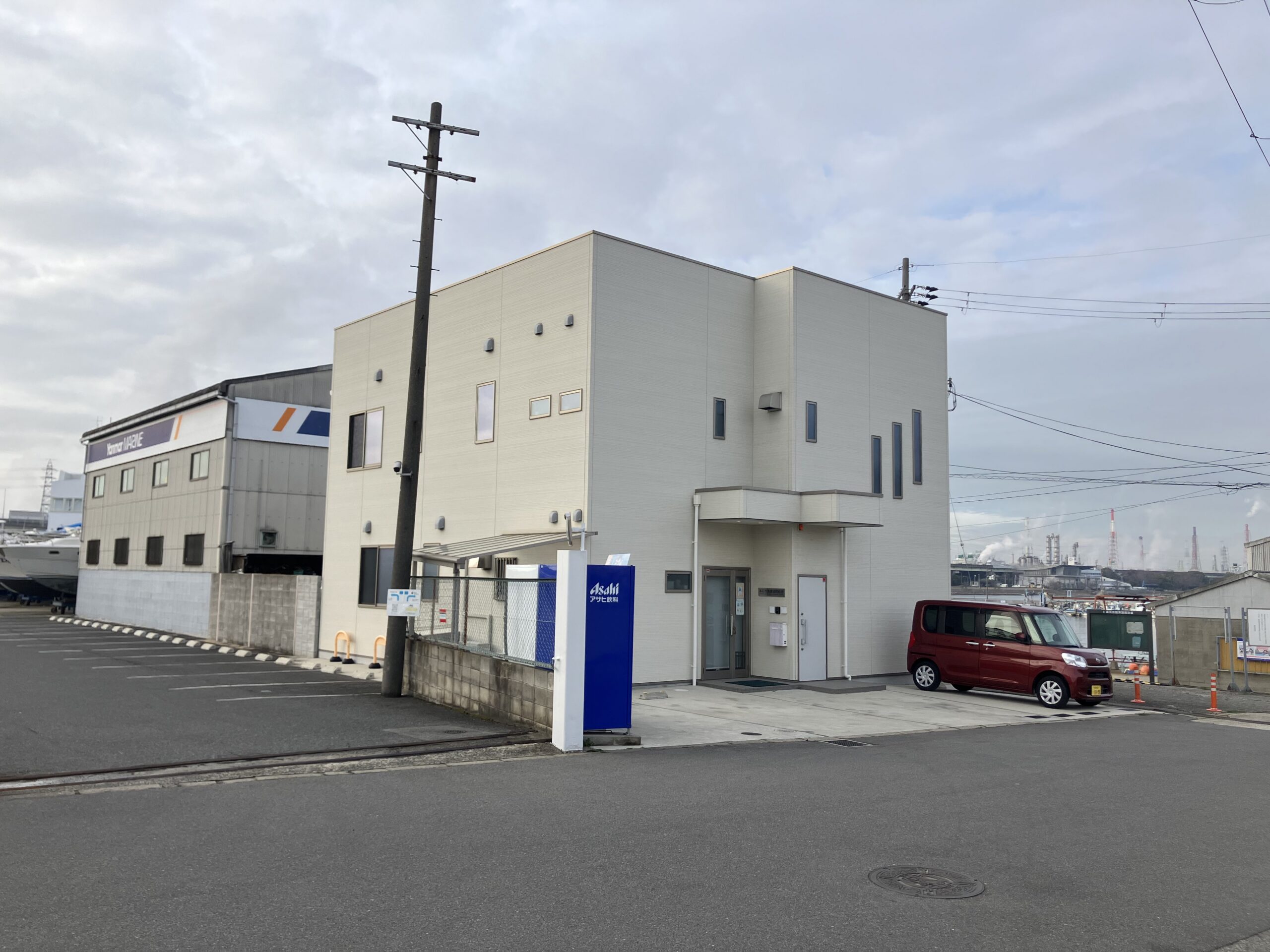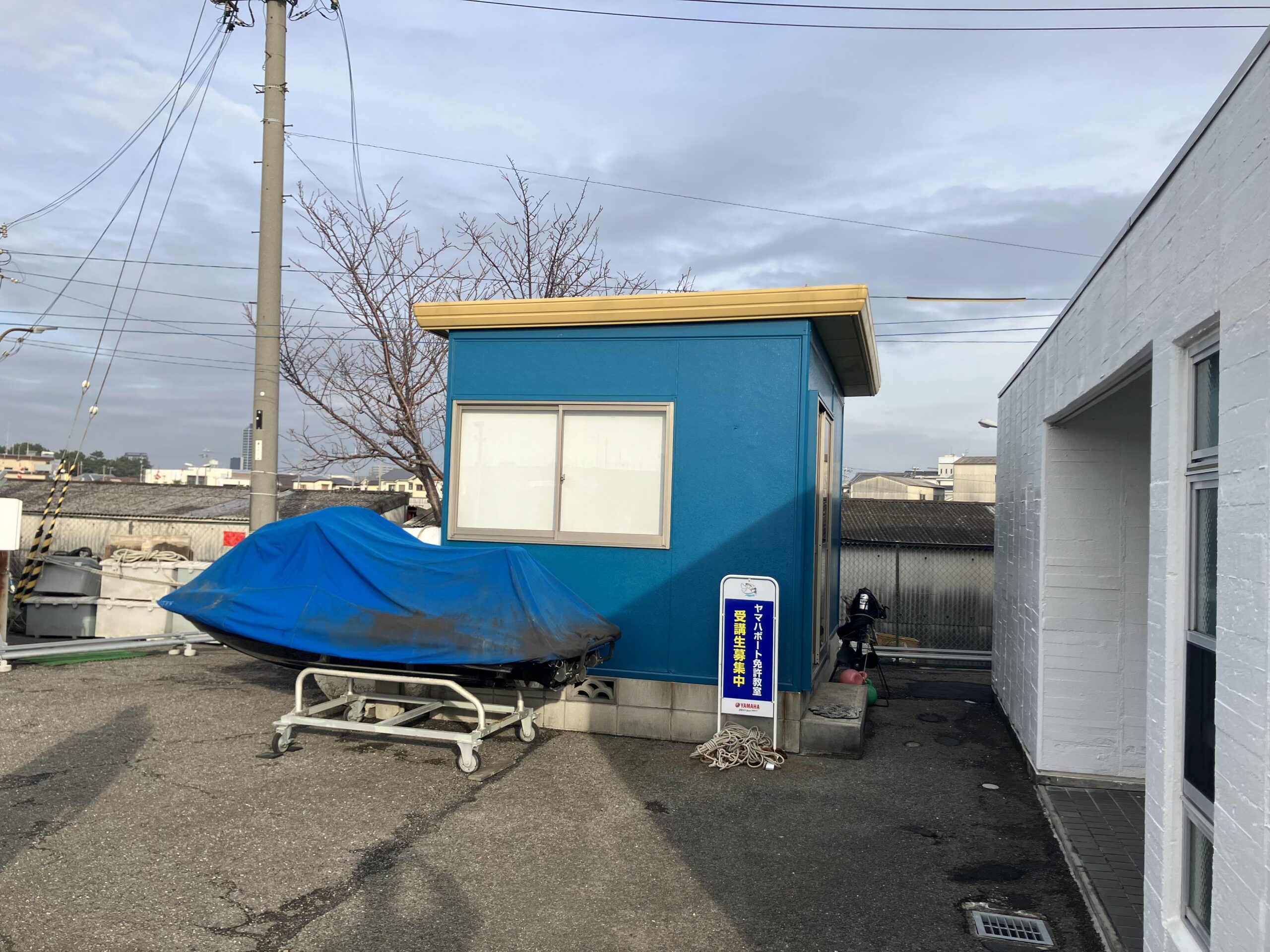 つきあたり右手の建物がヤマハボート免許教室となります。